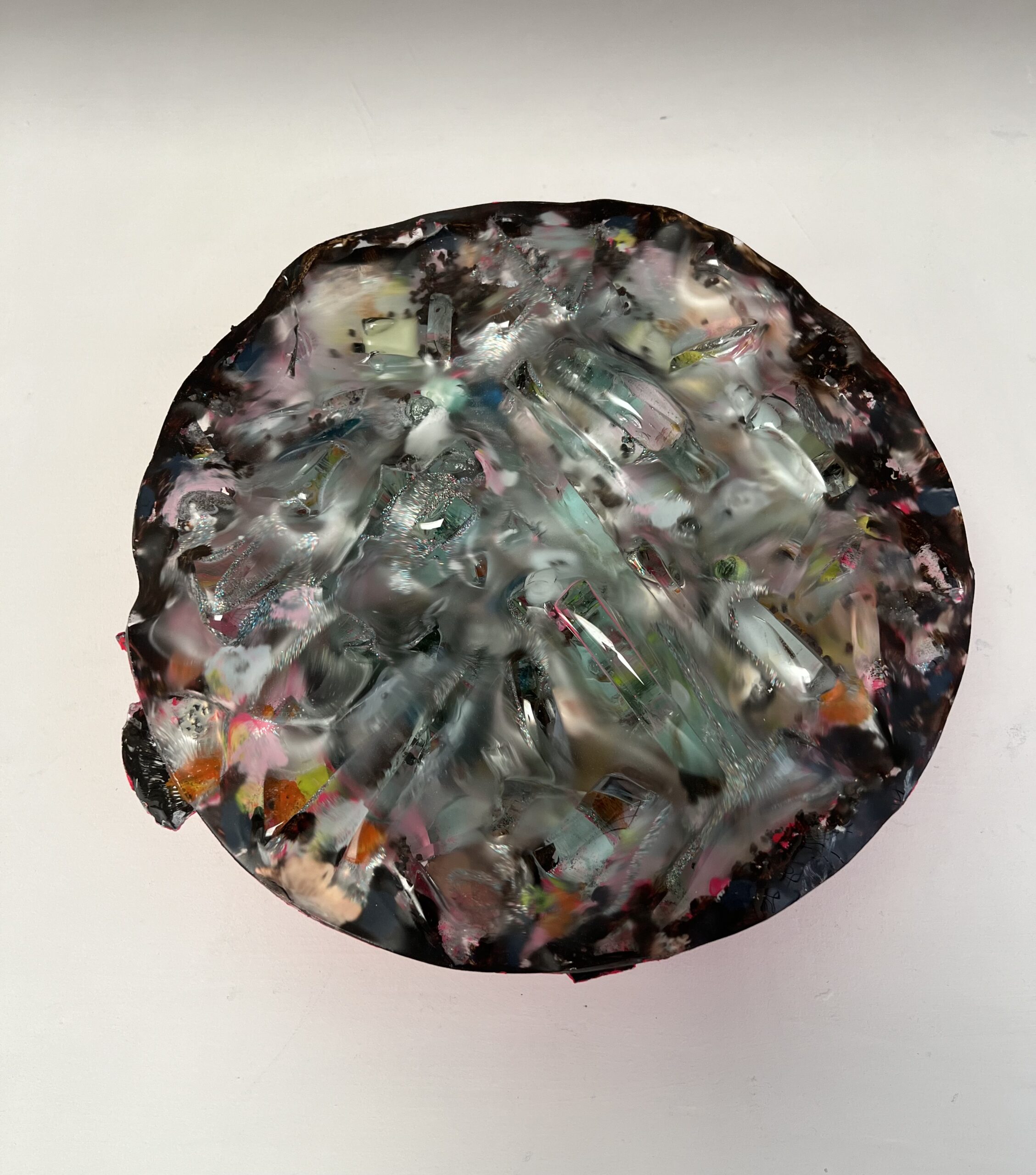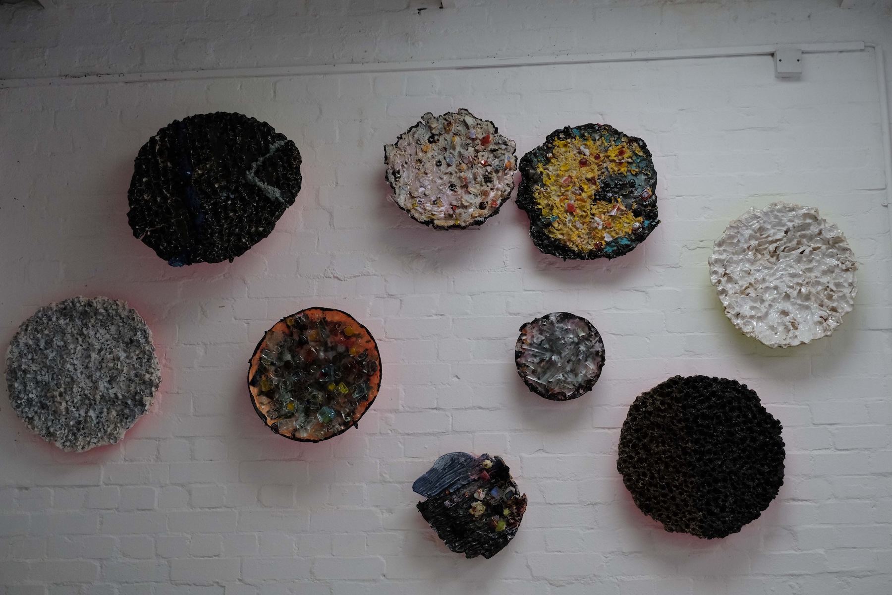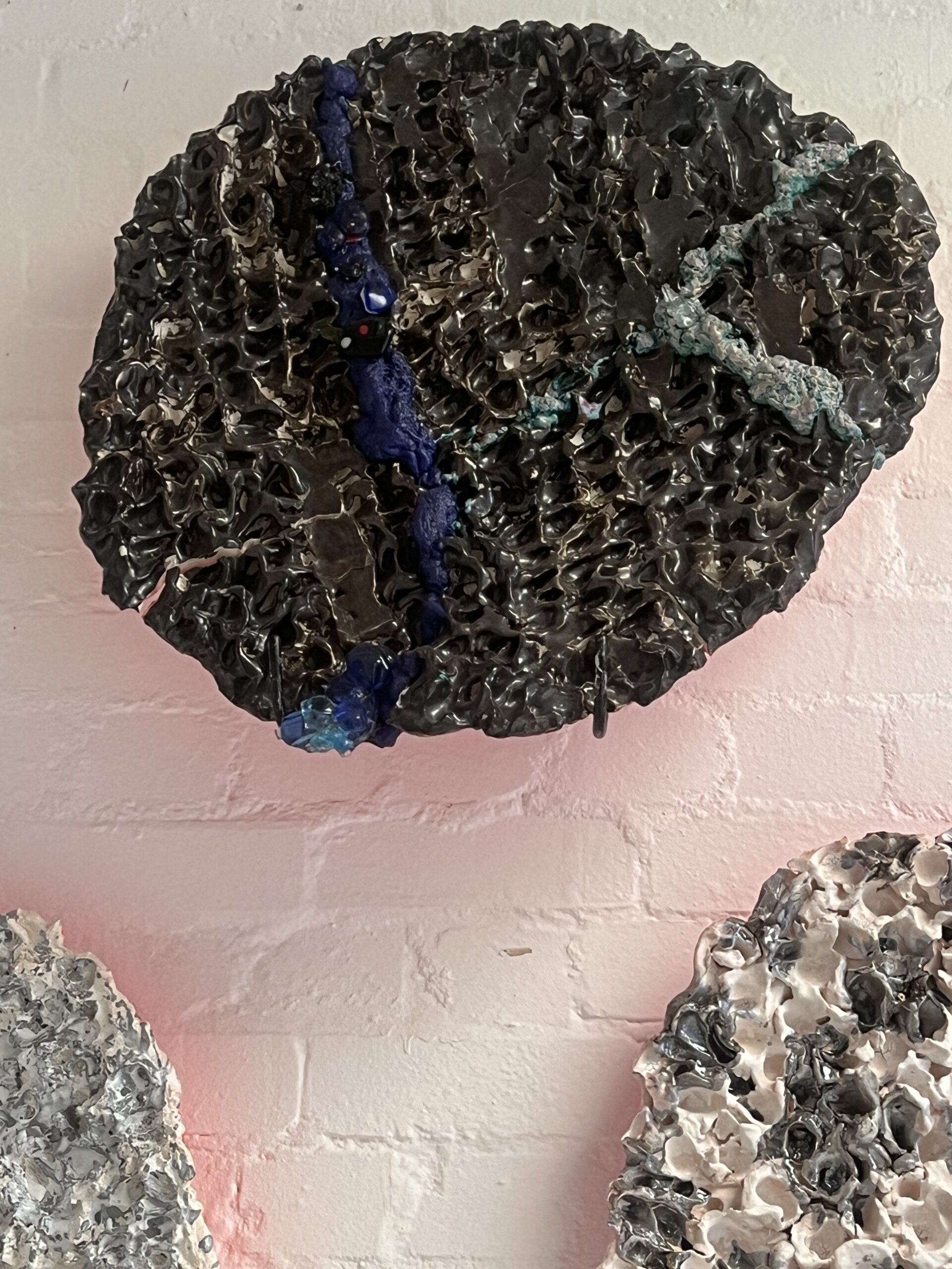 Highly textured stoneware plates, using a combination of glazes, lustres, glass and resin, with reflective backs.
