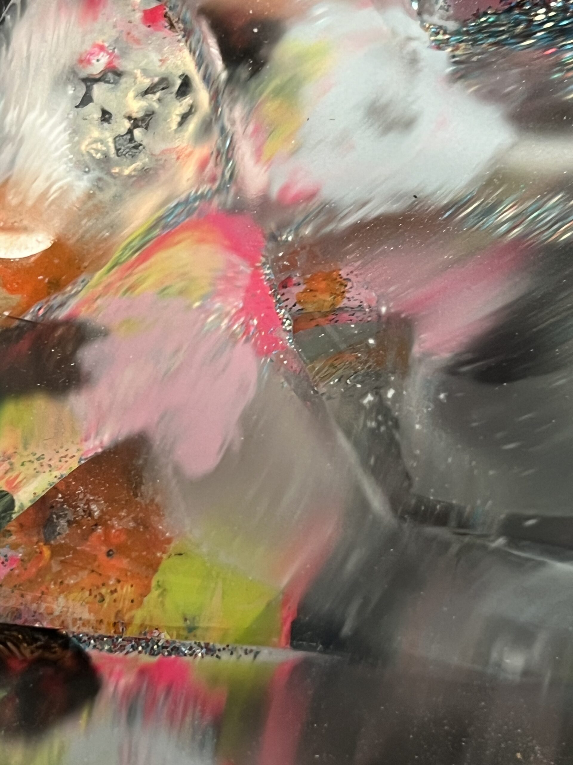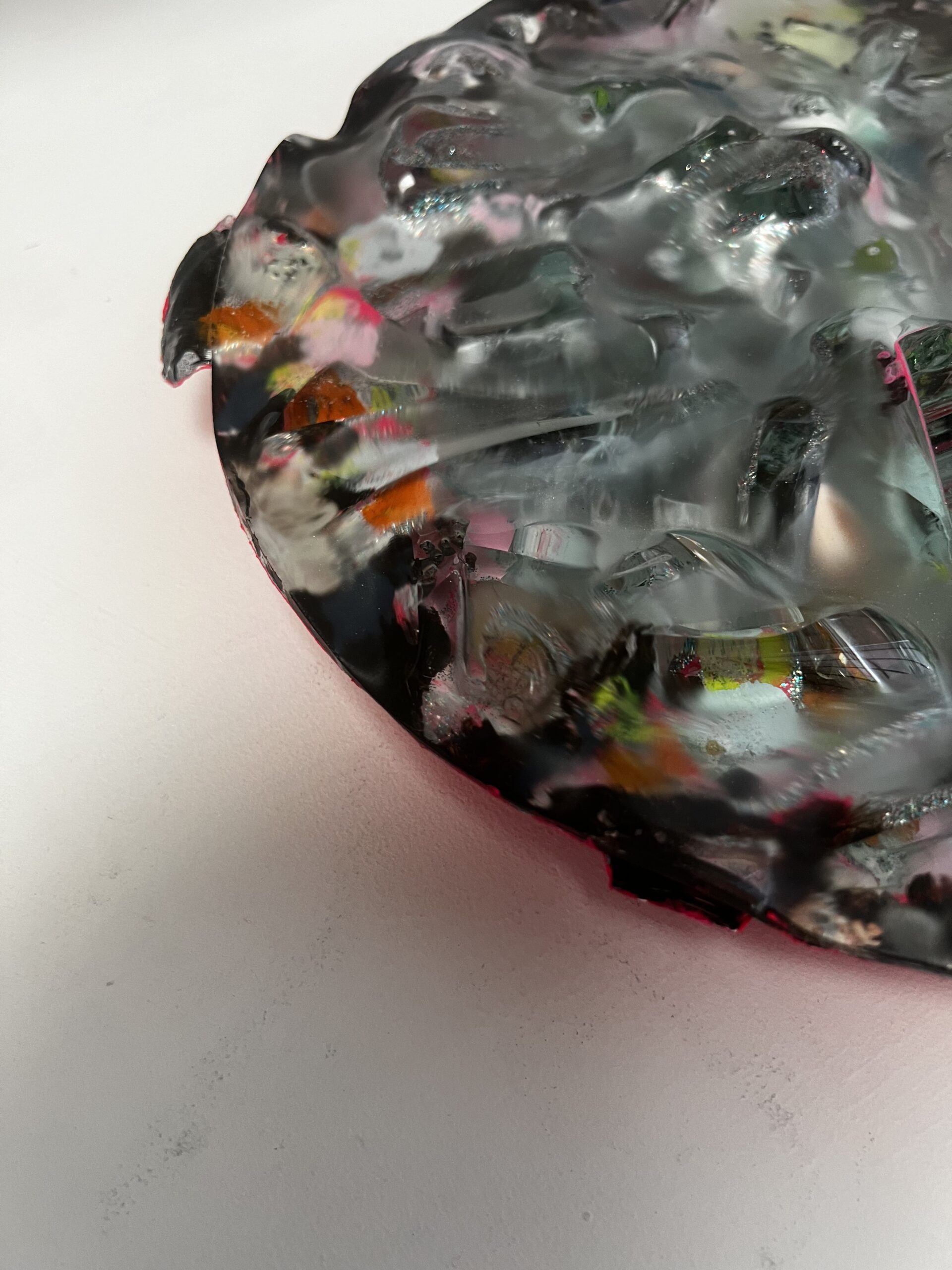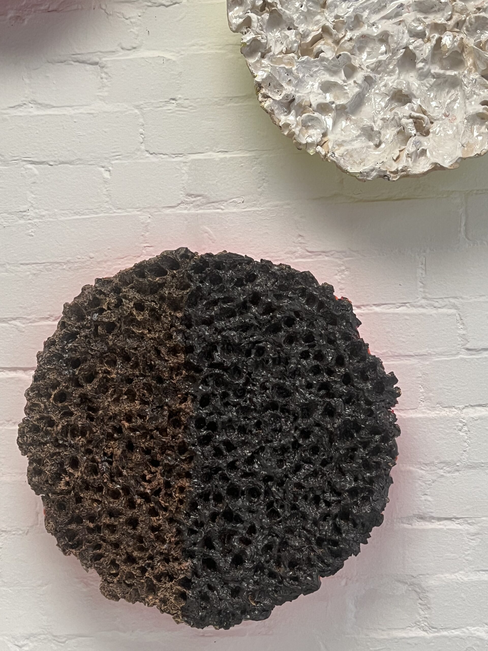 Highly textured stoneware plates, using a combination of glazes, lustres, glass and resin, with reflective backs.